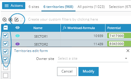 Edit the site of multiple territories in one operation, to group territories into regions