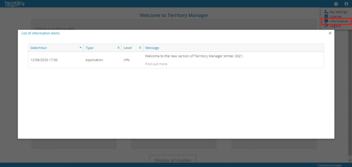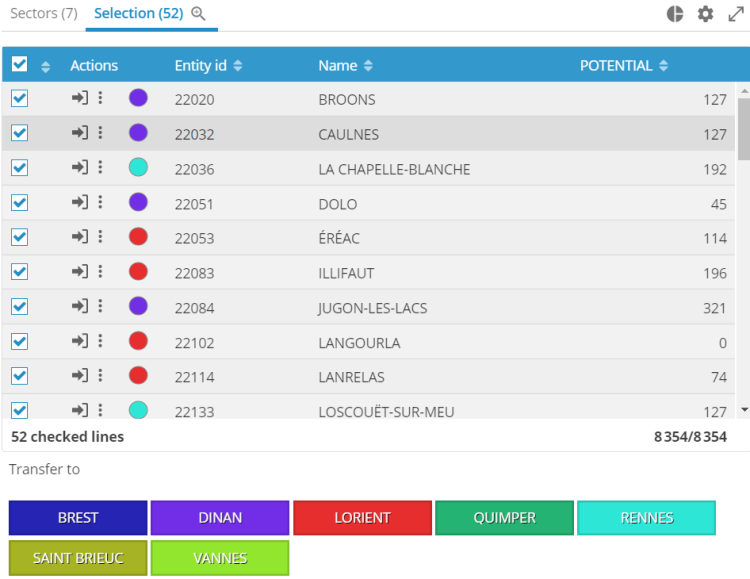 Note that on this occasion, the behavior of the Transfer menu of the table has been slightly revised. It is now always used to transfer the selected elements to a higher-level entity. To transfer territories to another territory, you must use the Merge menu.