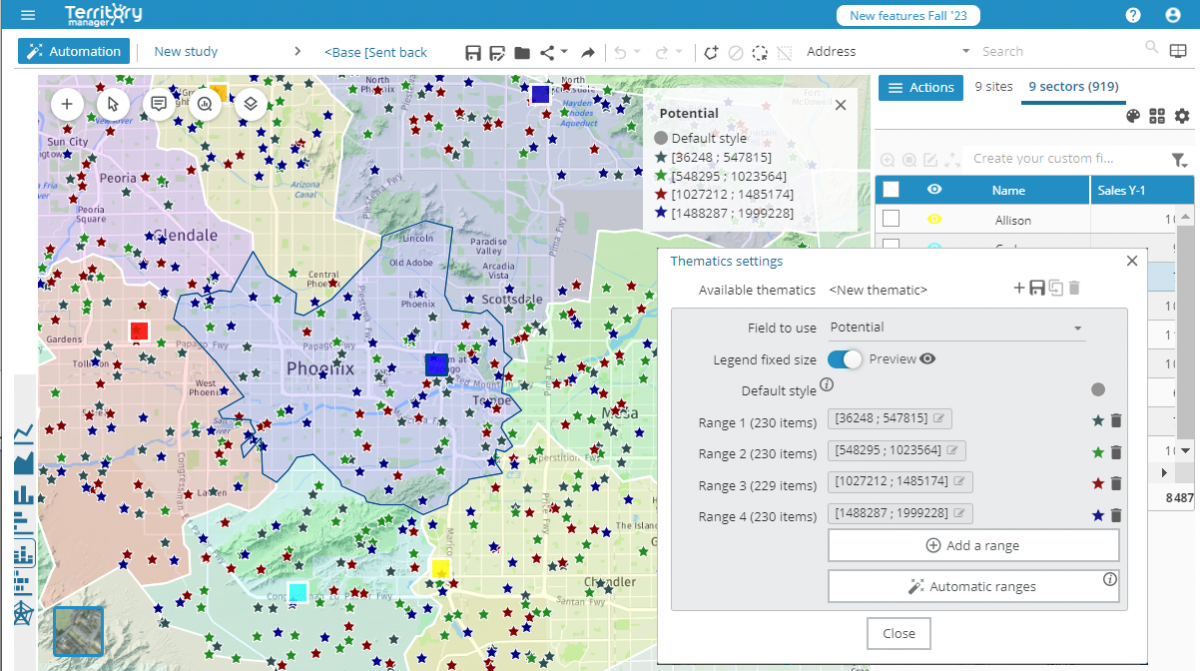 In order to update the display of your analytical representations easily, a new tool lets you set progressive sizes for the icons, color gradients throughout the ranges, change the icon for all ranges in a single clic, etc.