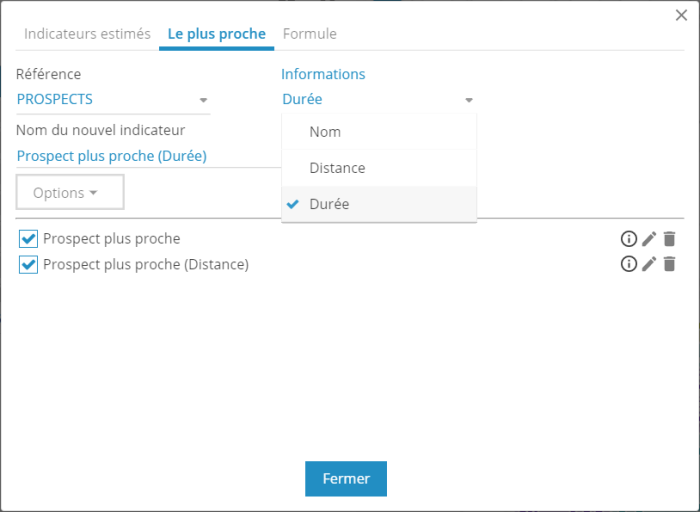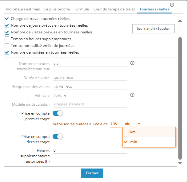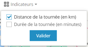Accessible depuis l'onglet Analyse, ce bouton permet l'ajout dans le tableau d'indicateurs supplémentaires afin de simuler la durée et/ou la distance d'une tournée optimisée pour chaque secteur