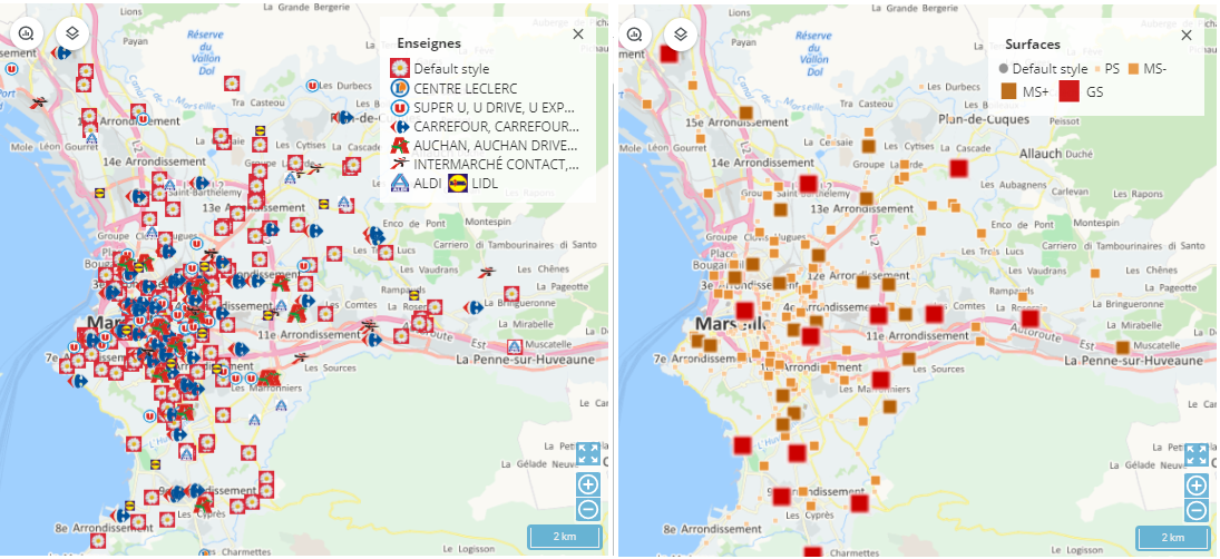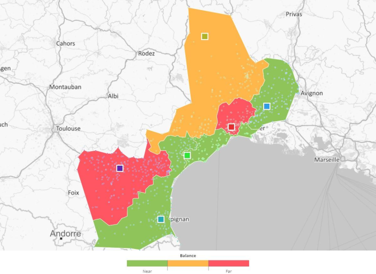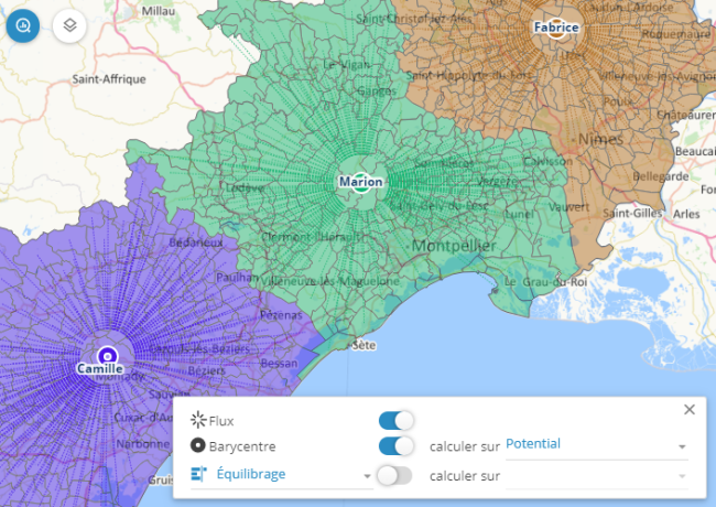 La fonction affectation permet, en se basant sur la proximité géographique entre les sites et les points, de générer des secteurs en utilisant de nouvelles contraintes, par exemple, en incluant une capacité maximale distincte à ne pas dépasser pour chaque site. Sans contraintes, les secteurs créés correspondent à des isochrones sans cannibalisation.