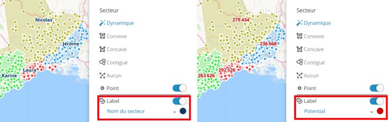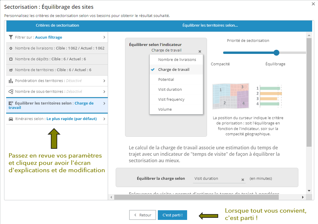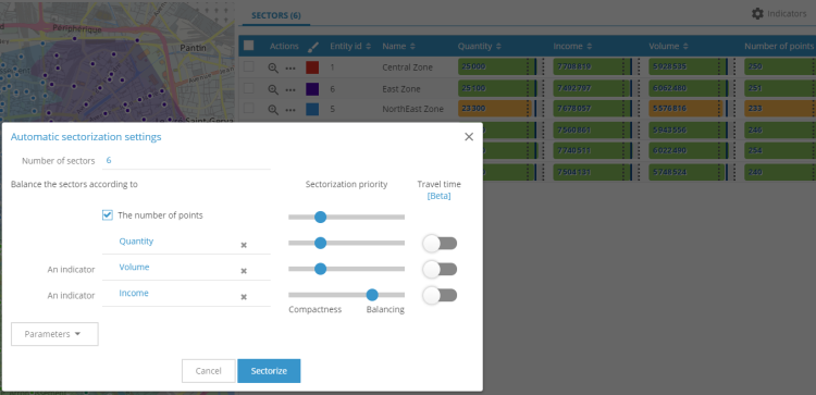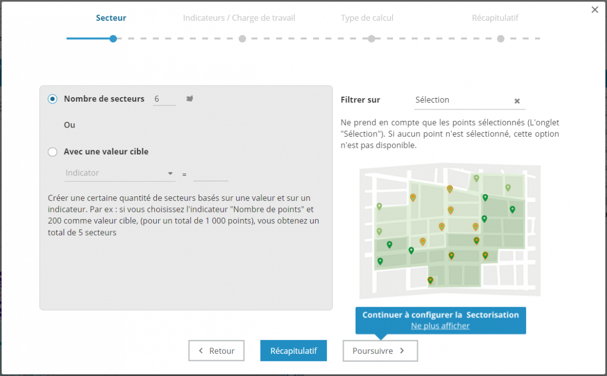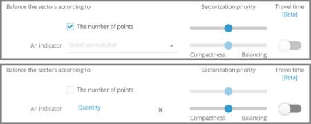 La sectorisation automatique autour de site autorise l'utilisation, au choix, du nombre de points ou d'un indicateur pour l'équilibrage.