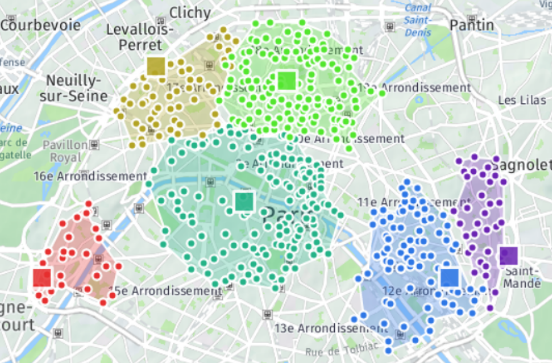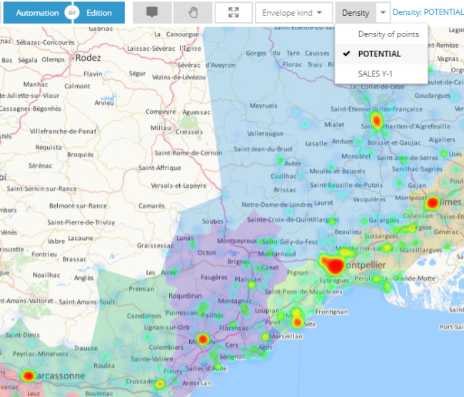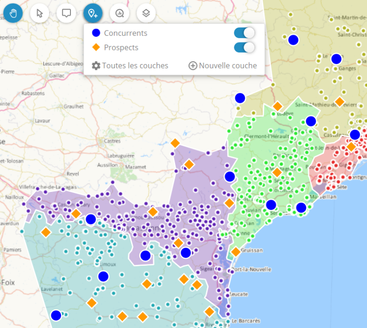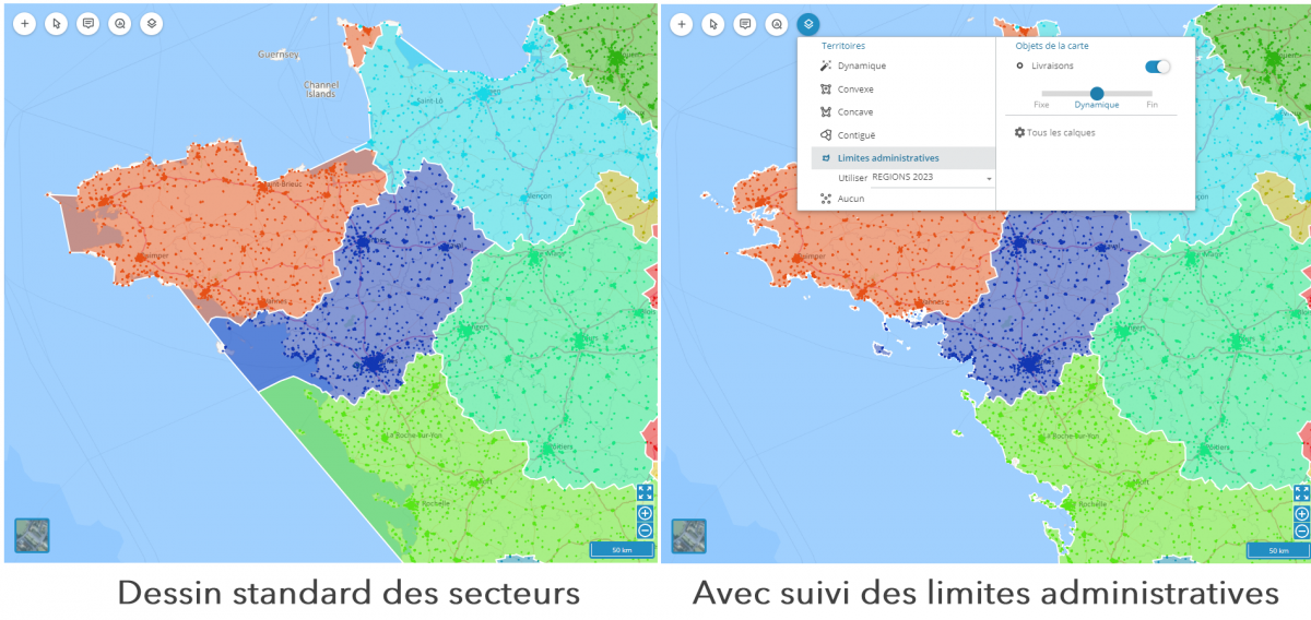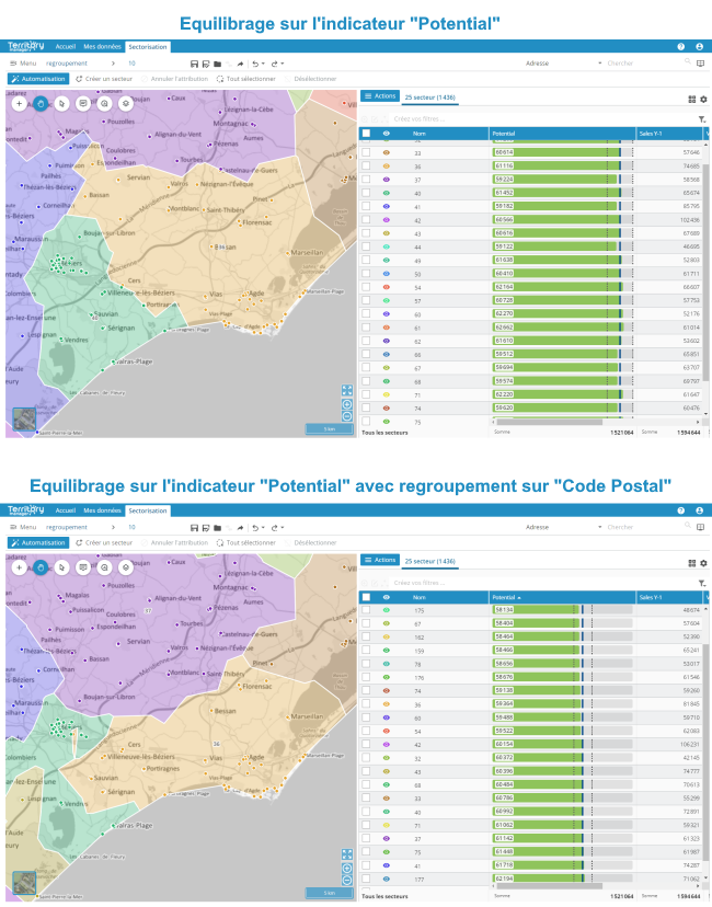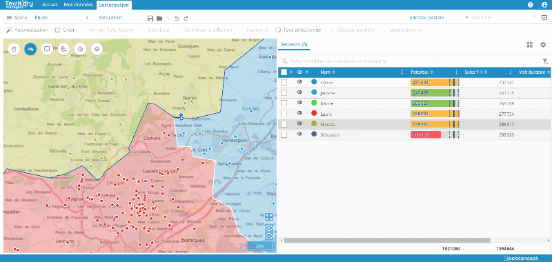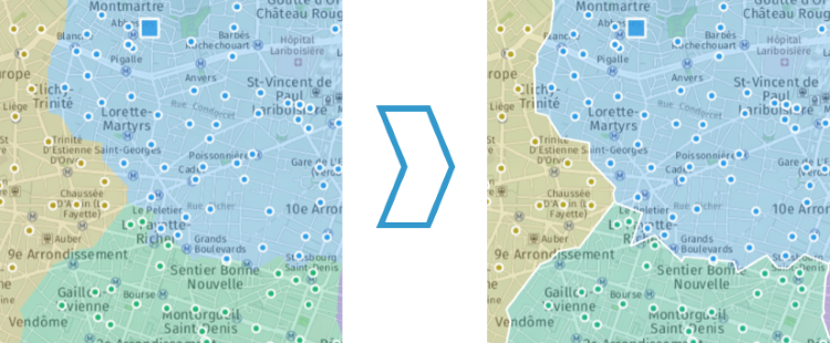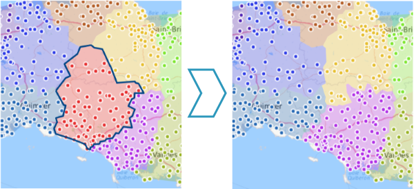 Vous pouvez ainsi travailler sur de très gros volumes de points, ou faire en sorte qu'une sectorisation suive les frontières d'entités géographiques (codes postaux, communes...) tout en travaillant avec des données portées par des points.