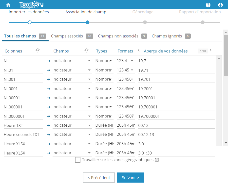 Territory Manager tente de détecter la meilleure option de formatage à partir de vos données (durée, nombre avec décimales...), vous facilitant ainsi encore plus la tâche.