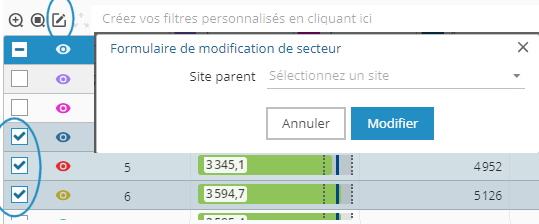 • Modifier le site de plusieurs secteurs en une seule opération, pour regrouper des secteurs en régions