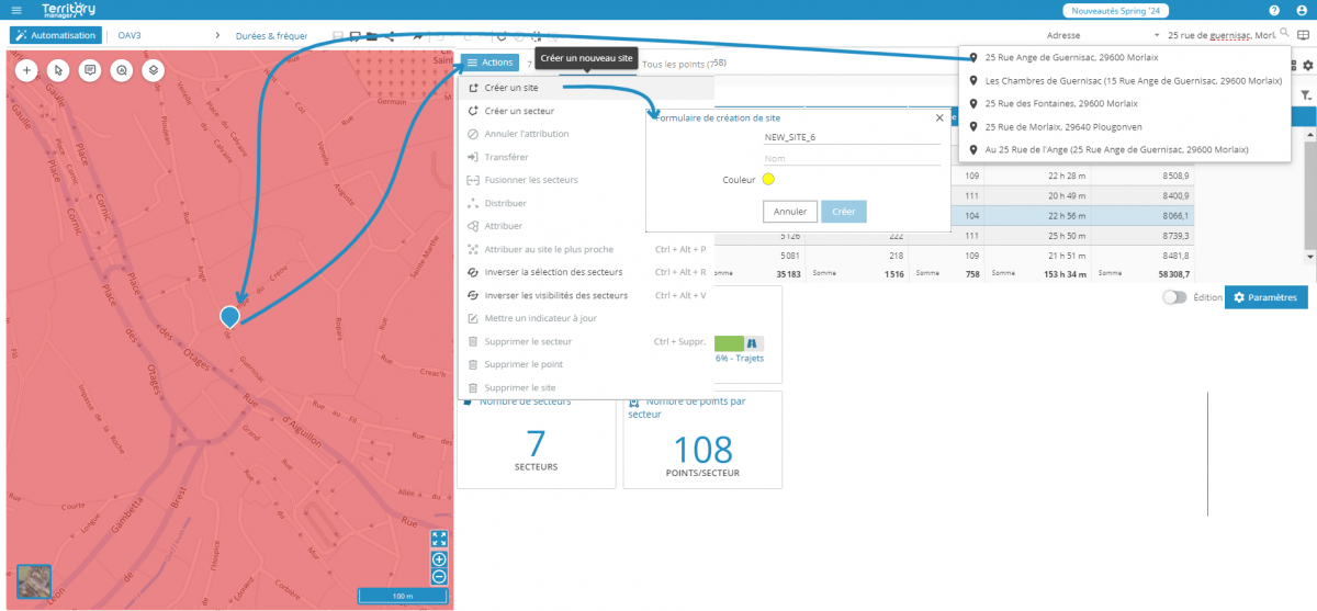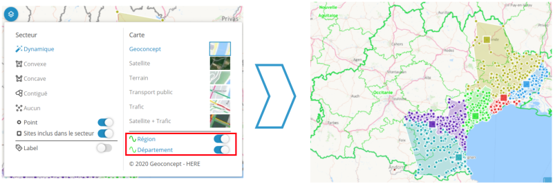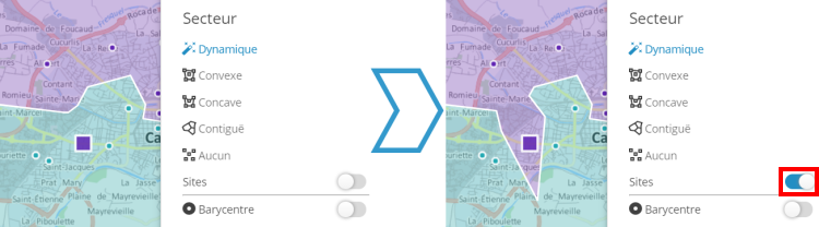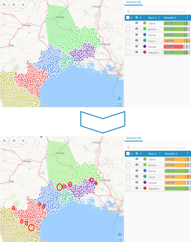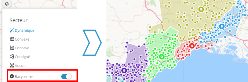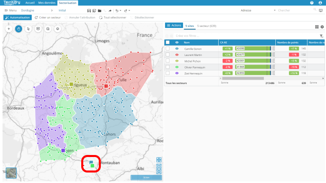 Pour simuler la fermeture d'une agence ou d'un site, cette nouvelle fonctionnalité redistribue un secteur et ses points aux secteurs à proximité.