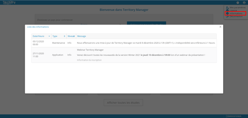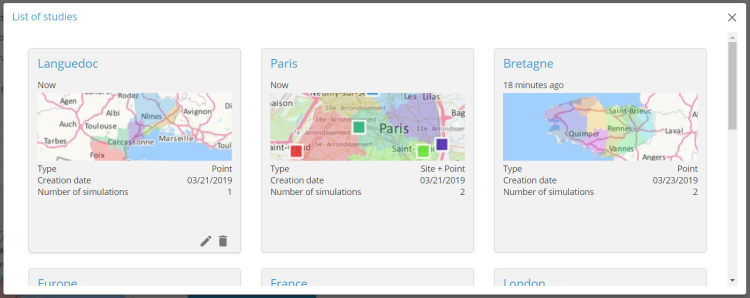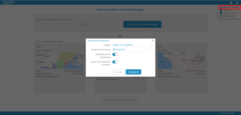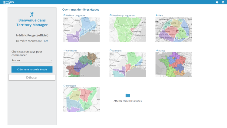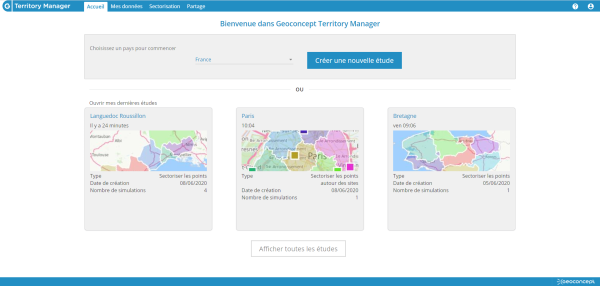 Les différentes simulations de sectorisation regroupées dans des études peuvent être dès à présent sauvegardées et consultées au sein de la solution. Depuis la page d'accueil, l’utilisateur peut choisir d'ouvrir une étude existante ou en créer une nouvelle.