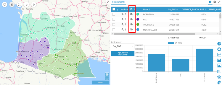 L'oeil dans l'onglet Secteurs permet d'afficher ou de masquer les secteurs correspondants simultanément dans la carte et dans le graphique.