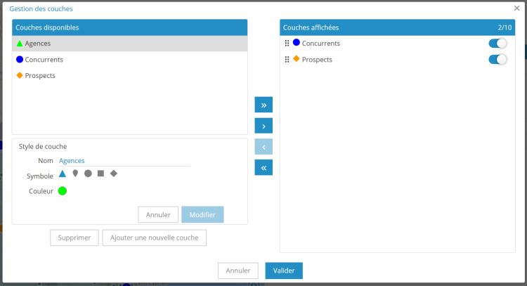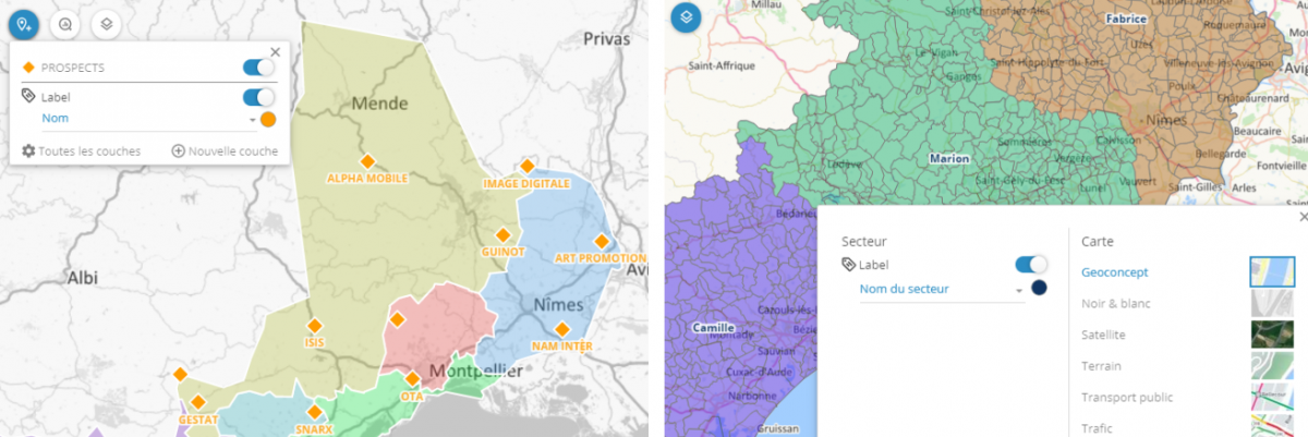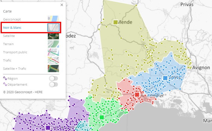 Réglez la luminosité, la saturation et la transparence de vos territoires. Vous pourrez mettre en avant les territoires avec des couleurs saturées, ou les esquisser avec des couleurs pastel, faire apparaitre la cartographie sous-jacente ou au contraire la recouvrir complètement.