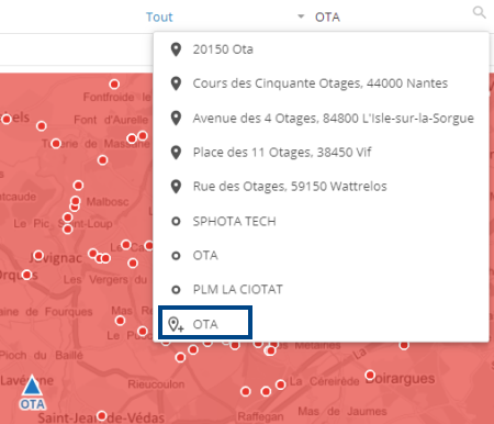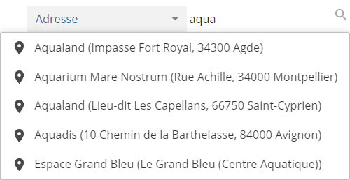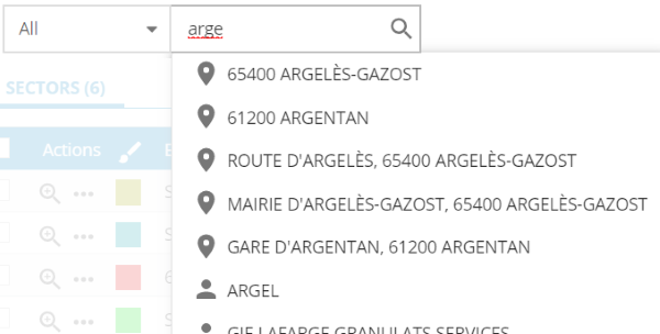 Cet outil permet de trouver facilement et d'afficher dans la carte et le tableau, via un mécanisme intuitif d'auto-complétion, un client, une adresse ou une commune que ce soit par un nom ou par un code.