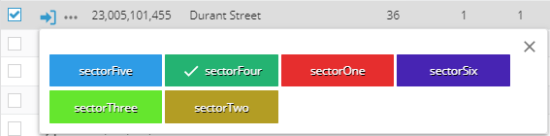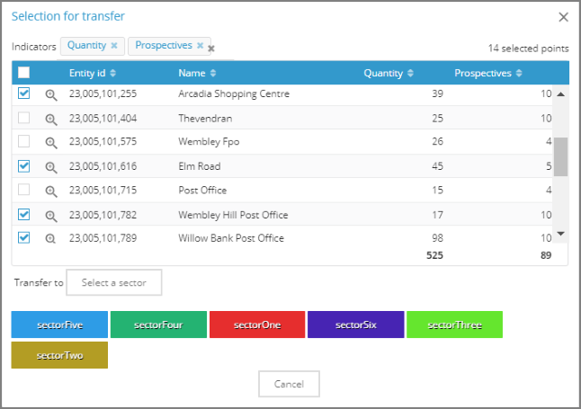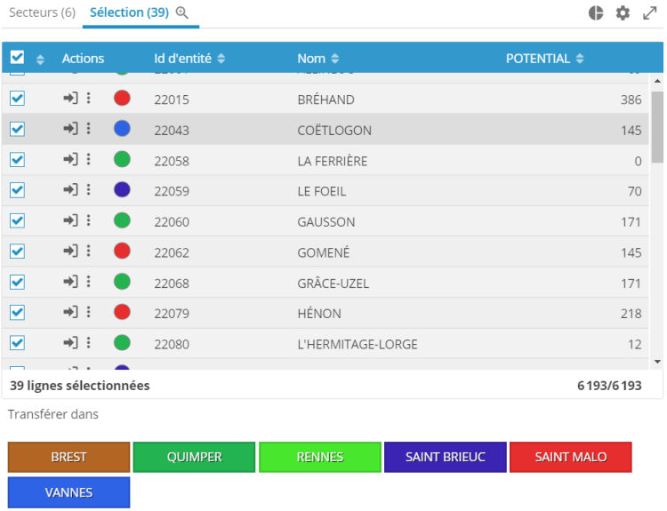 L'utilisateur peut sélectionner les objets depuis le tableau pour effectuer les opérations de transfert vers un autre secteur, annuler l'affectation et pour créer un nouveau secteur avec la sélection.
