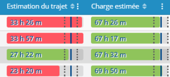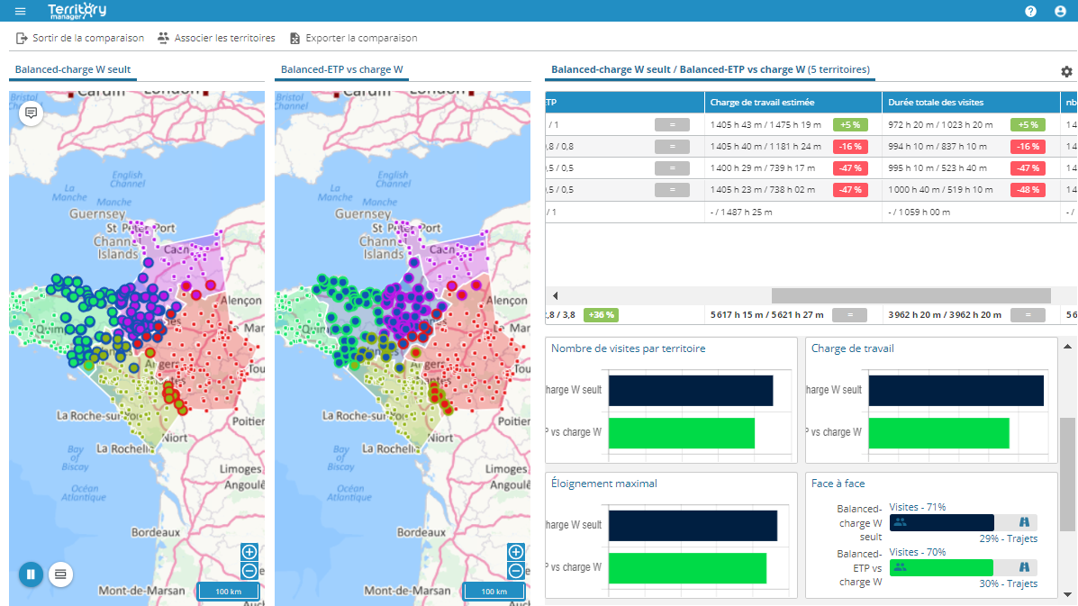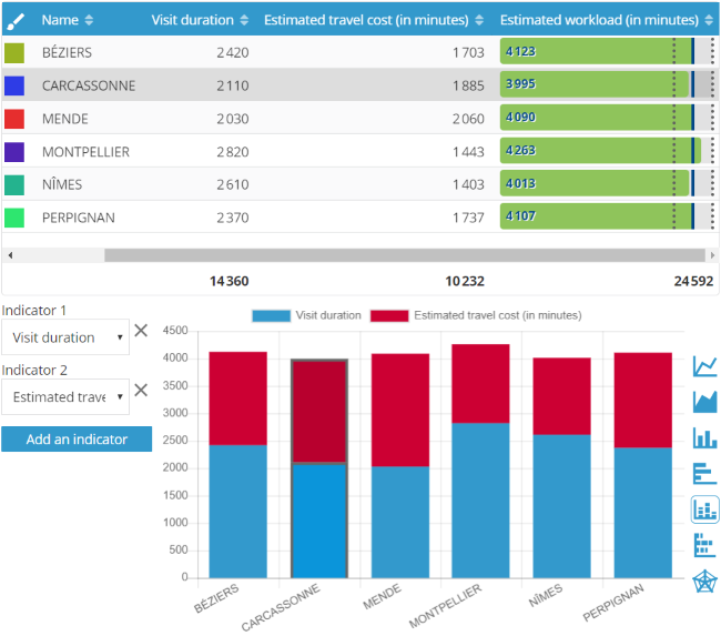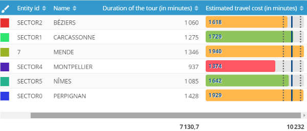 Associé aux graphiques dynamiques, l’équilibrage basé sur la charge de travail, en combinant estimation de temps de trajet et temps de visite, fournit des attributs complémentaires qui permettent une vision immédiate des écarts sectoriels.