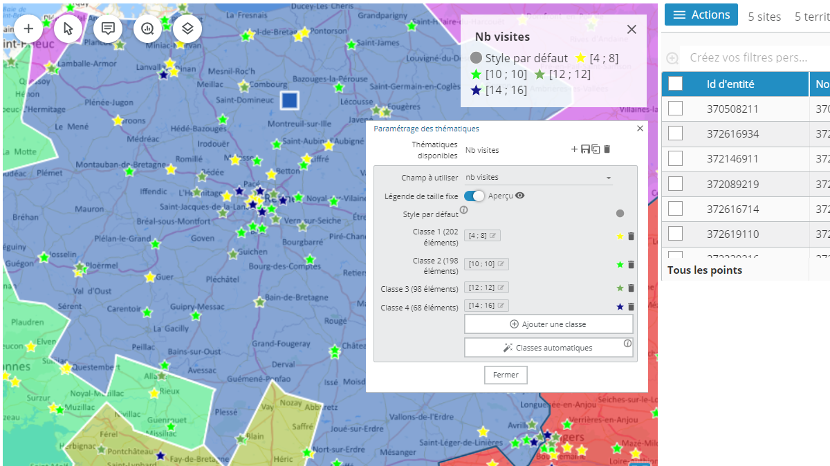 Deux modes de création automatique de classes (plages de valeurs) sont disponibles : plages de valeurs égales (intervalles égaux) ou plages variables pour avoir un nombre d'élément identique de chaque représentation (remplissage équilibré).
