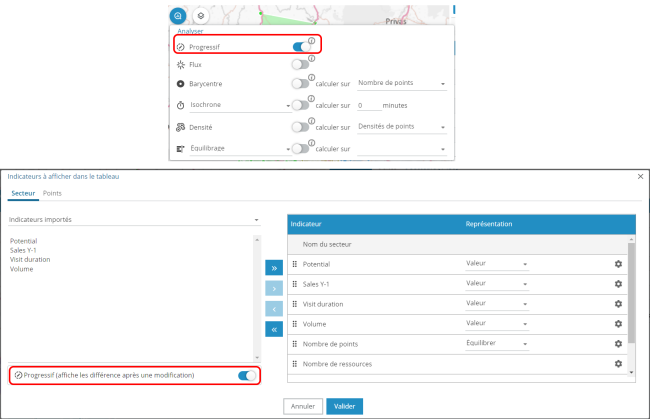 • La fenêtre de paramétrage d'indicateurs a été simplifiée, en y intégrant la possibilité d'en modifier l'ordre d'affichage des indicateurs par glisser-déposer. Enfin il est possible d'avoir une configuration différente entre les secteurs et les points / polygones.